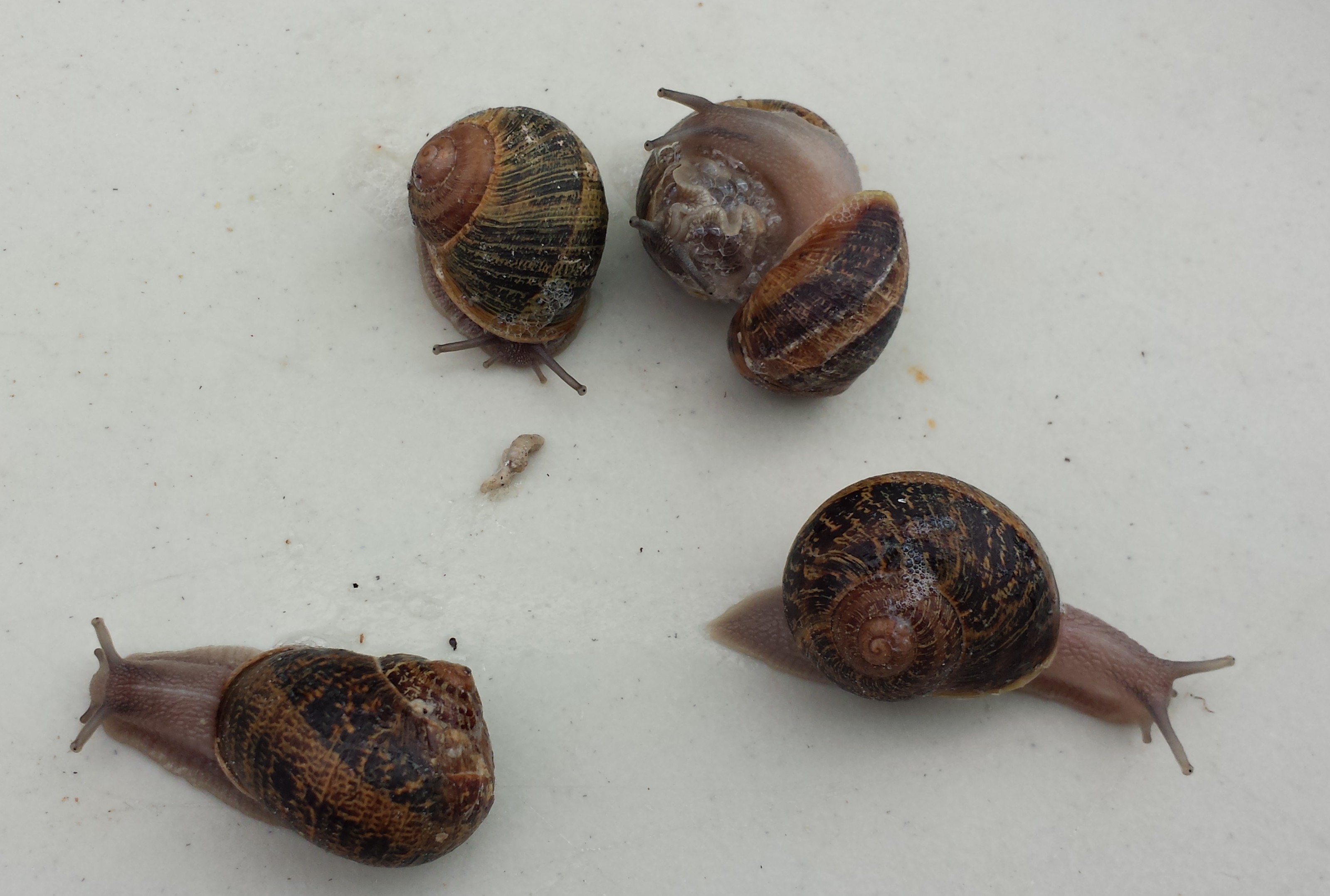 • The common garden snail or European Garden Snail, Cornu aspersum,  which 2014-10-01 12.21.35is related to the ones that are eaten there in huge quantities. These can, with careful preparation, be eaten also but are farmed at the Glasshouse Mountains at Glasshouse Gourmet Snails.
