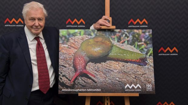 This beautiful Tasmanian snail Attenborougharion rubicundus was named in honour of Sir David Attenborough. This colourful semi-slug’s usual habitat is restricted to a small area of south-east Tasmania in wet forests on the Tasman and Forestier peninsulas. The species was first described in 1978 and classified in the genus, Helicarion. However, recent work by the Australian Museum scientists have shown it is a separate genus.
