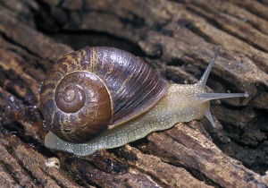 The European Garden Snail (Cornu aspersum) species is a very common garden and agricultural pest originally from Europe, the Middle East and North Africa, but now a widespread invader throughout the world. In Australia, it occurs in many temperate regions, but also in tropical areas where there has been significant alteration of microclimate by human activity – e.g. watering of gardens. The shell, which can reach a diameter of 40 mm, is brown with darker spiral bands, yellow speckles and a flame-like pattern. Individuals can been found living under pots, rocks and timber in gardens, parks, nurseries and on agricultural land. The animal is a light greenish brown colour with a pale stripe on the back of its neck and a greenish grey foot. [The European Garden Snail now classified as Cornu aspersum has previously been known as Cantareus aspersus and Helix aspersa.]