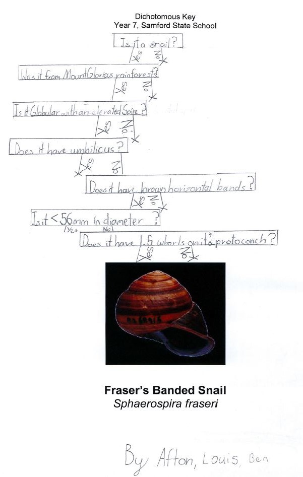 This native snail species is quite large, its shell reaching a diameter of up to 56 mm. The shell ranges from a tawny yellow to dark brown base-colour with many black spiral bands and a dark area behind the outer lip. Being quite rounded in shape, it also has an elevated spire and a bluish black lip. The animal is a dark grey to brown colour with a grey mantle. Fraser’s Banded Snail Fraser’s Banded Snail (Sphaerospira fraseri) can be found living under logs and rocks in rainforest, closed woodland and in some suburban areas that are adjacent to wet forest patches.